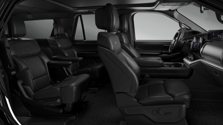 Inside, Platinum luxury surrounds you with Black Onyx leather-trimmed seating, heated and ventilated front seats, heated second row, and a power-folding third row. The massive 24 panoramic display with 13.2 center touchscreen, SYNC 4, wireless Apple CarPlay and Android Auto, wireless charging pad, and B&O sound system keep everyone connected and entertained. The Panoramic Vista Roof adds an open, airy feel for all three rows.