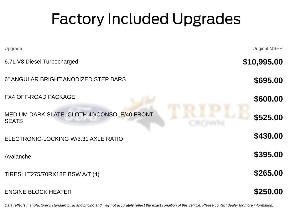 At Triple Crown Ford, we know Texans demand strength, dependability, and value in their trucks. Thats why we offer upfront pricing, no hidden add-ons, and a trusted local team. Whether youre in Stephenville, Weatherford, Granbury, Fort Worth, or anywhere across Texas, drivers choose Triple Crown Ford for unbeatable value, exceptional service, and Ford Super Duty trucks that are Built Ford Tough.2026 Ford F-250 XLT 4x4 Crew Cab SRW 6.7L Power Stroke V8 Diesel, Texas/Oklahoma Edition, FX4 Off-Road Package, Avalanche