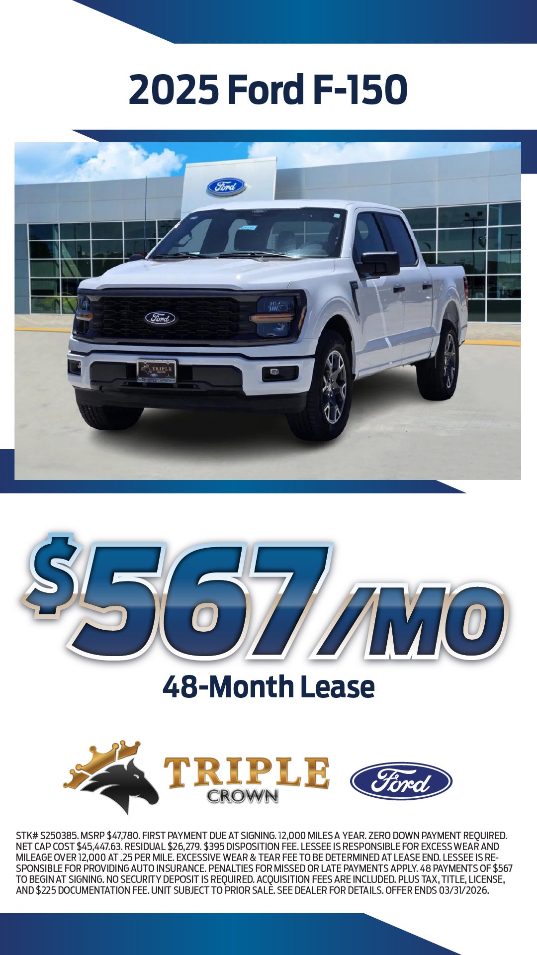 STK# S250385. MSRP $47,780. FIRST PAYMENT DUE AT SIGNING. 12,000 MILES A YEAR. ZERO DOWN PAYMENT REQUIRED. NET CAP COST $45,447.63. RESIDUAL $26,279. $395 DISPOSITION FEE. LESSEE IS RESPONSIBLE FOR EXCESS WEAR AND MILEAGE OVER 12,000 AT .25 PER MILE. EXCESSIVE WEAR & TEAR FEE TO BE DETERMINED AT LEASE END. LESSEE IS RESPONSIBLE FOR PROVIDING AUTO INSURANCE. PENALTIES FOR MISSED OR LATE PAYMENTS APPLY. 48 PAYMENTS OF $567 TO BEGIN AT SIGNING. NO SECURITY DEPOSIT IS REQUIRED. ACQUISITION FEES ARE INCLUDED. PLUS TAX, TITLE, LICENSE, AND $225 DOCUMENTATION FEE. UNIT SUBJECT TO PRIOR SALE. SEE DEALER FOR DETAILS. OFFER ENDS 03/31/2026.