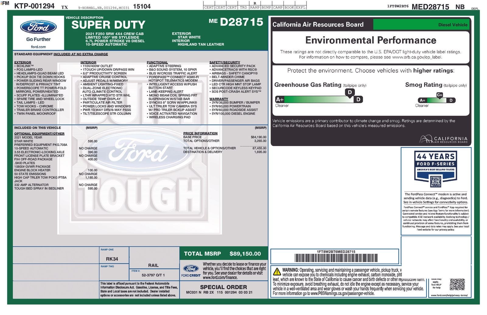 This 2021 Ford F-250SD comes nicely equipped with FX4 Off-Road Package, GVWR: 10,000 lb Payload Package, High Capacity Trailer Tow Package, Order Code 708A, Pro Trailer Backup Assist - High Capacity (Ultimate Trailer Tow Camera System), 10 Speakers, 110V/400W Outlet, 20 Polished Aluminum Wheels, 4-Wheel Disc Brakes, ABS brakes, Adjustable pedals, Air Conditioning, Alloy wheels, AM/FM radio: SiriusXM, Auto High-beam Headlights, Auto tilt-away steering wheel, Auto-dimming Rear-View mirror, Automatic temperature control, Brake assist, Bumpers: body-color, Compass, Delay-off headlights, Driver door bin, Driver vanity mirror, Dual front impact airbags, Dual front side impact airbags, Electronic Stability Control, Emergency communication system: SYNC 3 911 Assist, Engine Block Heater, Exterior Parking Camera Rear, Flow-Through Console, Front anti-roll bar, Front Bucket Seats, Front Center Armrest, Front dual zone A/C, Front fog lights, Front reading lights, Fully automatic headlights, Garage door transmitter, Heated door mirrors, Heated front seats, Heated rear seats, HEATED STEERING WHEEL, Illuminated entry, Leather steering wheel, Low tire pressure warning, Memory seat, Navigation System, Outside temperature display, Overhead airbag, Overhead console, Panic alarm, Passenger door bin, Passenger vanity mirror, Pedal memory, Power door mirrors, Power driver seat, Power moonroof, Power passenger seat, Power steering, Power windows, Radio data system, Radio: B&O System by Bang & Olufsen, Rain–Sensitive Windshield Wipers, Rear Parking Sensors, Rear reading lights, Rear seat center armrest, Rear step bumper, Rear window defroster, Remote keyless entry, Security system, SiriusXM Radio, Speed control, Speed-sensing steering, Split folding rear seat, Steering wheel memory, Steering wheel mounted A/C controls, Steering wheel mounted audio controls, SYNC 3 Communications & Entertainment System, Tachometer, Telescoping steering wheel, Tilt steering wheel, Tough Bed Spray-In Bedliner, Traction control, Trip computer, Turn signal indicator mirrors, Unique Limited 2-Tone Leather 40/Console/40 Seats, Variably intermittent wipers, and Ventilated front seats.